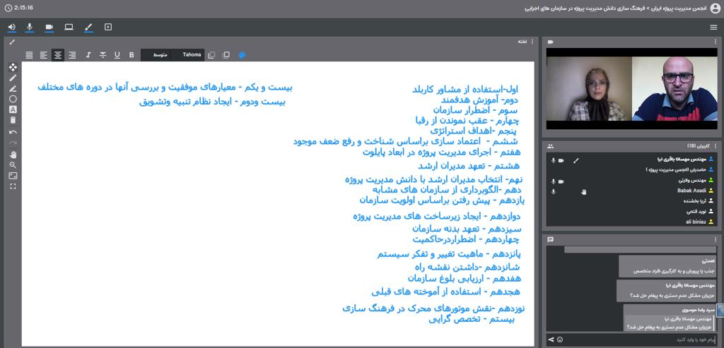 در این جلسه همچنین یک مدیرعامل، دو مدیر پروژه، یک تحلیل گر کسب و کار ، شش کارشناس شاغل دفتر مدیریت پروژه و فارغ التحصیلان کارشناسی ارشد و دکتری رشته های مرتبط حضور داشتند.
